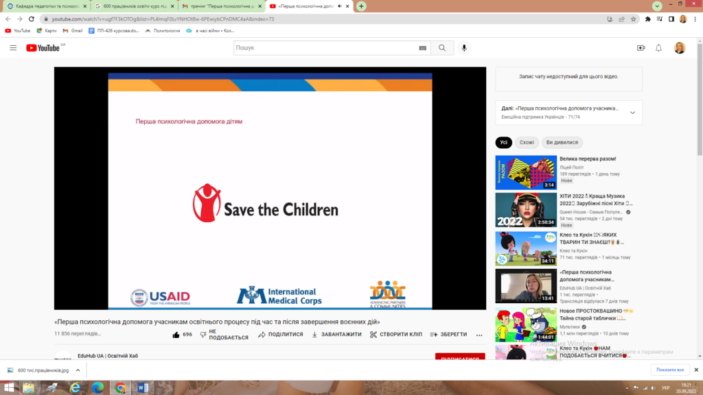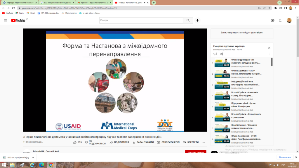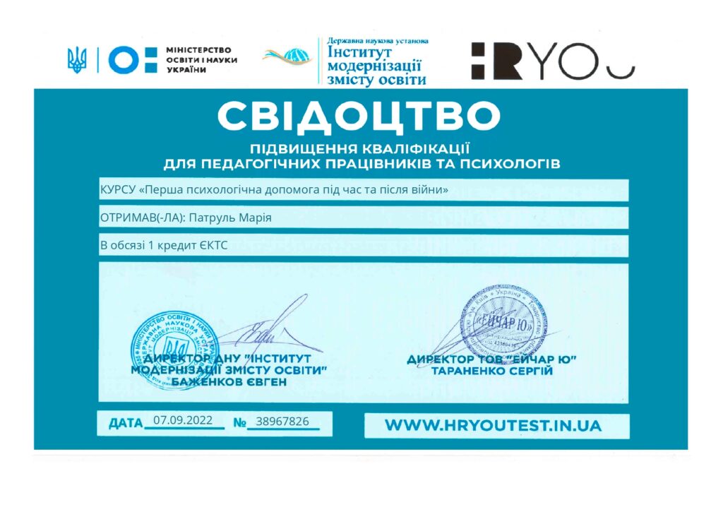 Протягом серпня 2022 року старший викладач кафедри педагогіки та психології професійної освіти факультету лінгвістики та соціальних комунікацій  Марія Патруль проходила курс підвищення кваліфікації «Перша психологічна допомога учасникам освітнього процесу під час і після завершення воєнних дій» на порталі Всеукраїнського проєкту з профорієнтації та побудови кар’єри Міністерства освіти і науки України.