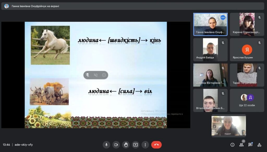 29 вересня 2022 року під керівництвом доцента кафедри української мови та культури Онуфрійчук Г.І. відбулося засідання студентського наукового гуртка на тему «Концептуальна картина світу та фразеологія в мовленні українців» зі студентами 1 курсу юридичного факультету, аерокосмічного факультету та факультету архітектури, будівництва та дизайну. Науковий гурток був присвячений дослідженню символьних фразеологізмів в українській мові. Значне зацікавлення на засіданні в студентів викликала інформація щодо перенесення в народному мовленні символічних ознак тварини на людину. У підсумку присутні зазначили, що анімістичний світогляд народу яскраво представлений у фразеологізмах, які характеризують особистість через контакти з тваринним світом.