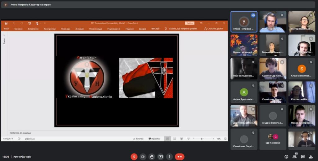 25 жовтня 2022 року відбувся вебінар, присвячений аналізу ролі ОУН-УПА у визволенні України від окупантів у ХХ ст. До вебінару долучилися студенти ФККПІ НАУ. Модератор заходу, доцентка кафедри української мови та культури Уляна Кошетар, запропонувала навчальний матеріал з теми. Зокрема відбулось обговорення діяльності ОУН-УПА – армії й організації, створеної українцями для боротьби з тогочасними ворогами. З незламним духом, відшліфованим історичною боротьбою, прикладом якої є герої ОУН-УПА, посиленням військової спроможності завдяки особистій відданості, Україна сьогодні не тільки змагається на полі битви, але також є захистом для всього світу. У 80-ту річницю створення УПА ми знову виборюємо українську незалежність.