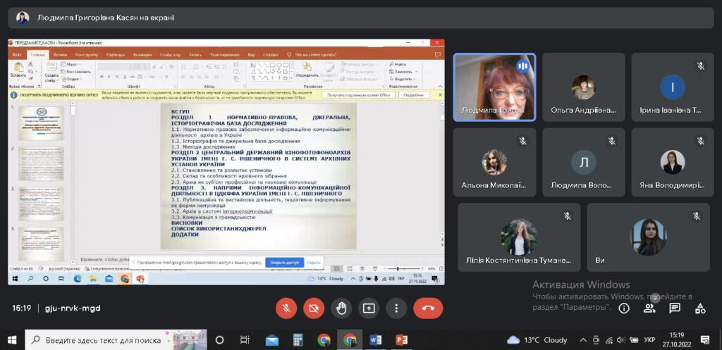 27 жовтня 2022 р. на кафедрі історії та документознавства ФЛСК НАУ в режимі онлайн відбувся перед захист кваліфікаційних робіт здобувачів вищої освіти ОС «Магістр» спеціальності «Інформаційна, бібліотечна та архівна справа» денної форми навчання. Свої роботи представили здобувачі вищої освіти Безлюдна А.М. (Імідж юридичної установи як форма соціальної комунікації ), Драговоз В.Ю. (Протидія дезінформації та фейкам в інформаційному середовищі України у період війни Росії проти України), Касян Л.Г. (Інформаційно-комунікаційна діяльність Центрального державного кінофотофоноархіву України імені Г. С. Пшеничного), Туманевич Л.К. (Документаційне забезпечення адвокатської діяльності в Україні), Шаран Я.В. (Електронні інформаційні ресурси та послуги Центру надання адміністративних послуг Камінь-Каширської міської ради). Вони підготували презентації своїх досліджень, доповіли про стан їх готовності. Члени комісії з перед захисту (Голова – Тюрменко І.І., члени комісії та наукові керівники – Божук Л.В., Курченко Т.Є., Халецька Л.П., Юрченко О.А., ознайомившись заздалегідь з роботами здобувачів, обговорили стан їх виконання, задали здобувачам запитання по темах досліджень, внесли слушні пропозиції щодо уточнення окремих позицій. Були встановлені остаточні терміни подання робіт на перевірку нормо контролеру, на рецензування тощо. Деяким студентам було поставлене завдання терміново доробити окремі підрозділи своїх робіт та представити їх додатково на розгляд наукового керівника до 07.11.22.