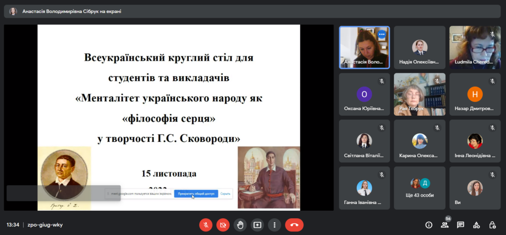 У рамках відзначення 300-річчя від дня народження Григорія Сковороди в Національному авіаційному університеті 15 листопада 2022 року відбувся науковий захід, організований кафедрою української мови та культури, – Всеукраїнський круглий стіл «Менталітет українського народу як «філософія серця» у творчості Г.С.Сковороди». Круглий стіл був присвячений актуальним питанням творчості видатного українця, відомого поза межами нашої країни, автора, твори якого є актуальними і на часі завжди. До роботи конференції доєдналися учасники з НАУ, а також гості – викладачі та студенти з Рівненського державного гуманітарного університету, Національного університету «Полтавська політехніка імені Юрія Кондратюка», Національного університету біоресурсів і природокористування України, Державного університету телекомунікацій, Відокремленого структурного підрозділу «Фаховий коледж інформаційних технологій та землевпорядкування НАУ», Рівненського економіко-технологічного коледжу НУВГП, Обласного наукового ліцею в м.Рівне Рівненської обласної ради.