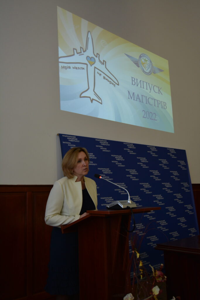 З вітальним словом до випускників звернулася проректор з гуманітарної політики та інновацій НАУ Світлана Тімкіна, яка високо оцінила вклад випускників у розвиток студентського самоврядування університету, побажала їм наснаги, віри у завтрашній день, завжди повертатися у стіни рідної alma mater і, звичайно, – мирного неба!