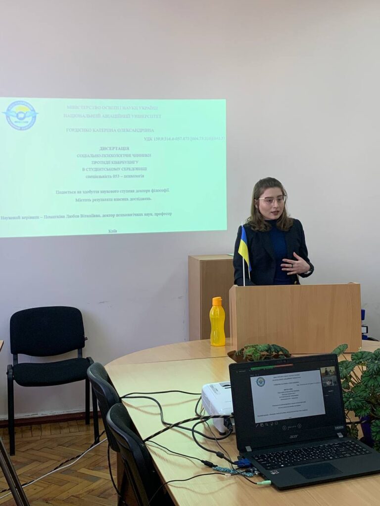 20 лютого 2023 року на факультеті лінгвістики та соціальних комунікацій відбувся офіційний прилюдний захист дисертації на здобуття ступеня доктора філософії в галузі знань 05 «Соціальні та поведінкові науки» за спеціальністю 053 «Психологія» Гордієнко Катерини Олександрівни із теми: «Соціально-психологічні чинники протидії кібербулінгу в студентському середовищі». Науковий керівник: завідувач кафедри авіаційної психології, доктор психол.н., професор Помиткіна Л.В.