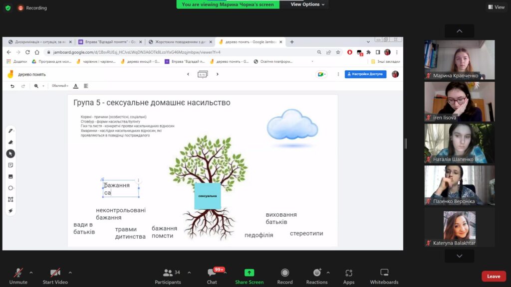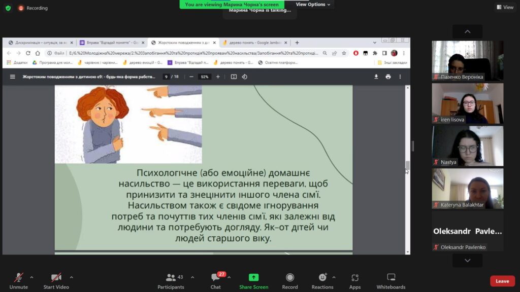 Лекторки Кузнєцова А. та Чорна М. Хмельницького національного університету спеціальності «Соціальна робота. Соціальна педагогіка та коучинг» актуалізували увагу учасників (викладачів, здобувачів вищої освіти ОП “Практична психологія” на проблемах насильства в сім’ї як серйозному порушенні прав людини, які держава має відстоювати та захищати. Серед них – право на життя і фізичну недоторканність; право не бути об’єктом знущань чи жорсткого поводження; право на здоровий та безпечний розвиток.