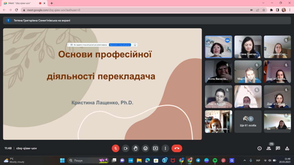 20 березня 2023 року доценти кафедри англійської філології і перекладу ФЛСК Тетяна Семигінівська та Алла Сітко організували майстер клас з фріланс-перекладачем Кристиною Лащенко. Метою було ознайомити студентів зі специфікою роботи перекладача-практика, зорієнтувати щодо вибору тематики перекладів, умов оплати, можливих проблем Читати далі