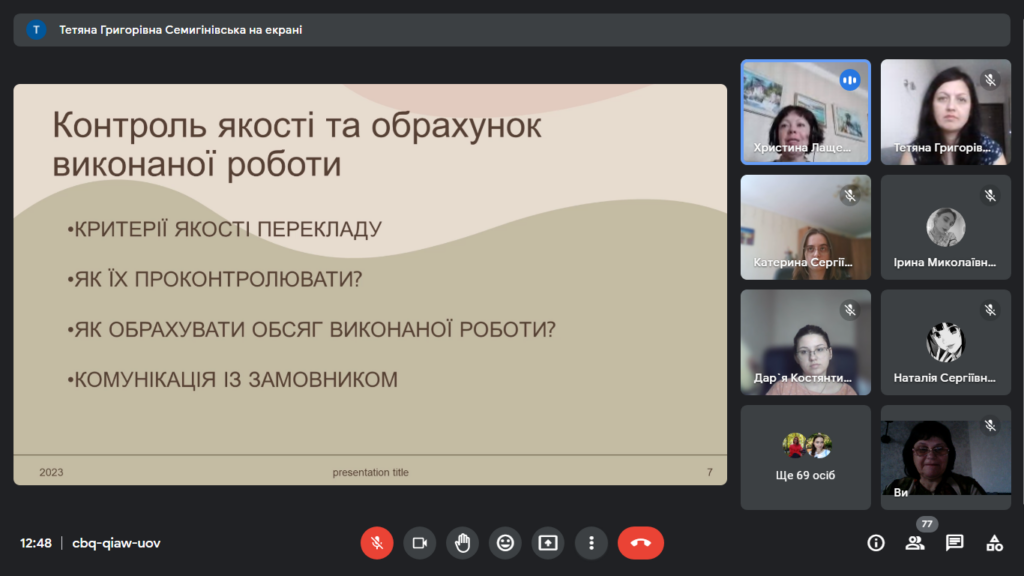 Пані Кристина професійно й майстерно зупинилася на таких важливих для майбутніх перекладачів питаннях, як: професійні об’єднання перекладачів, на засобах автоматизації перекладу, видах усного перекладу та його стандартах, на контролі якості й обрахунку виконаної роботи.