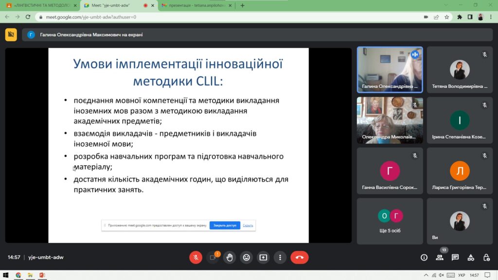 Щире зацікавлення та жваве обговорення викликали доповіді начальника кафедри лінгвопедагогічного забезпечення професійної діяльності Воєнно-дипломатичної академії доктора педагогічних наук, професора Лагодинського О.С., представника кафедри іноземних мов Військового інституту телекомунікацій та інформатизації імені Героїв Крут Кравченка О.Г., представників кафедри іноземних мов за фахом ФЛСК НАУ: кандидата філологічних наук, професора Акмалдінової О.М., доцентів кафедри іноземних мов за фахом Гурської О.О., Теремінко Л.Г. та старших викладачів Максимович Г.О., Анпілогової Т.В., Сорокун Г.В, Козелецької І. С. та аспірантки кафедри української мови Українського державного університету ім. М.П.Драгоманова, викладача кафедри іноземних мов за фахом Дишлевої Г.В.