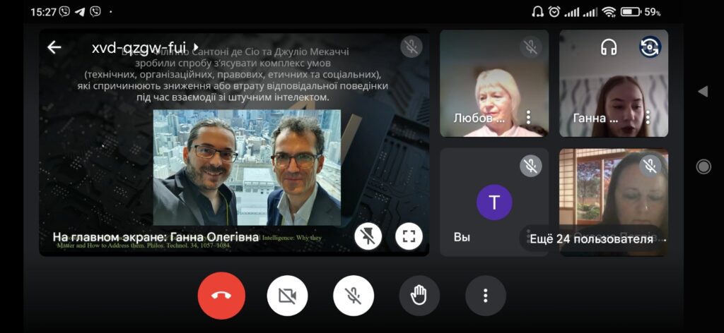 5 квітня 2023 року у межах онлайн-роботи ХХІІI Міжнародної науково-практичної конференції здобувачів вищої освіти і молодих учених «Політ. Сучасні проблеми науки» кафедра філософії провела засідання своєї секції: «Актуальні проблеми сучасного філософського знання» на платформі Meet. У роботі конференції, крім студентів НАУ взяли участь представники Київського національного університету імені Тараса Шевченка (Київ), Національної академії внутрішніх справ (Київ), Державного податкового університету (Ірпінь), Центральноукраїнського державного університету імені Володимира Винниченка (Кропивницький). Учасникам конференції була представлена Програма секції «Актуальні проблеми сучасного філософського знання» та секретар секції – доцент Скиба О.П. Вона визначила формат роботи засідання та його регламент. Загалом у Програмі було представлено 45 пошукових тем від здобувачів вищої освіти.