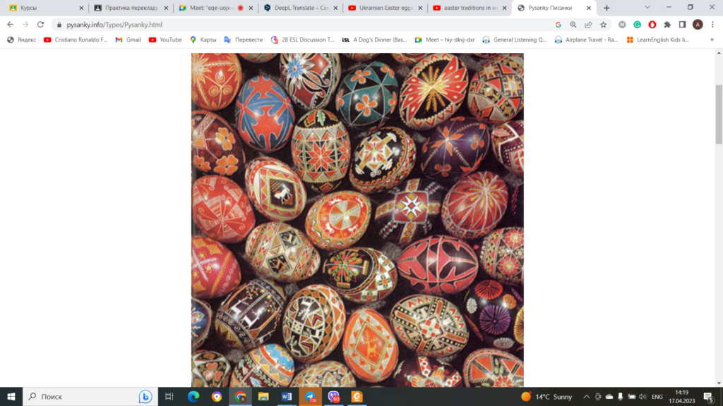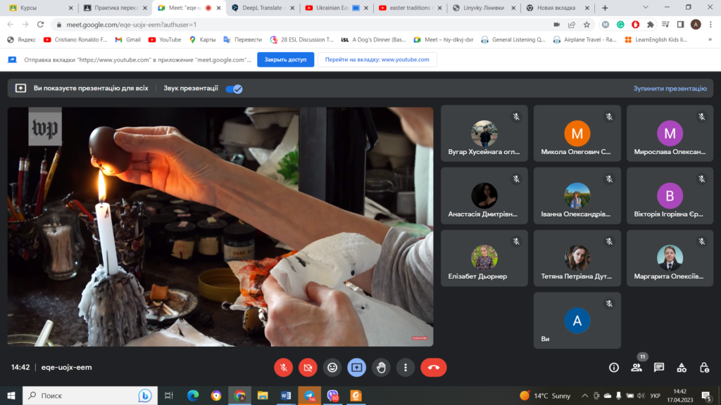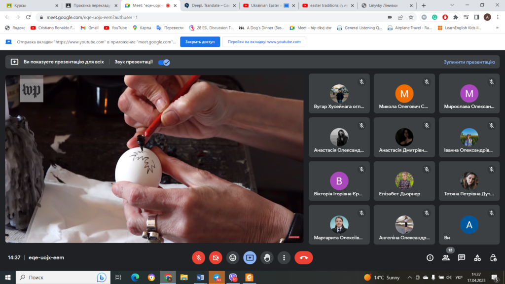 17 квітня на годині корпоративної культури старший викладач Анна Щербина разом з кураторською групою ФЛ-401 подивились відео-матеріал “Українські великодні яйця як мистецтво опору” (https://www.youtube.com/watch?v=BhG0DsouU-I…) та обговорили історію виникнення пасхальних яєць та їх без перебільшення неймовірно важливе значення для українського народу. Писанка також унікальний витвір українського мистецтва, їй присвячуються вірші та пісні. Провадяться наукові дослідження та пишуться цілі трактати. Але писанка — це не лише витвір мистецтва, а й код нації, письмо тисячоліть, зафіксоване нашими пращурами і передане нам. Писанка – справжня гордість нашого народу! Однак, зауважимо, що в Україні існують іще багато видів великодніх яєць: крашанки, дряпанки, шкрябанки, мальованки, крапанки, бісерівки тощо. Разом зі студентами Анна Щербина розглянула англомовний сайт, який містить інформації про всі різновиди великодніх яєць (http://www.pysanky.info/PYSANKY/Pysanka_Home.html), особливу увагу звернули на історію походження назв декорованих яєць, а також способи відтворення цих слів-реалій англійською мовою. Виникла жвава дискусія, під час якої студенти обговорили символізм великодніх яєць, наскільки різноманітними бувають візерунки та кольорова гамма, яку використовують в різних регіонах нашої могутньої України. Різноманітність описаних символів дає можливість зрозуміти глибину мудрості українського народу, його вміння оберігати себе, свою оселю, родину, життя, утворювати магічне писанкове коло захисту в обрядах та звичаях. Писанка як прояв людської творчості, що має багатовікову історію, яка криється в українській етнічній свідомості, завжди буде невід’ємною частиною сучасної світової культури. Вивчення писанки, її символічної значущості формує більш глибоке розуміння сьогодення крізь призму традицій та народності.