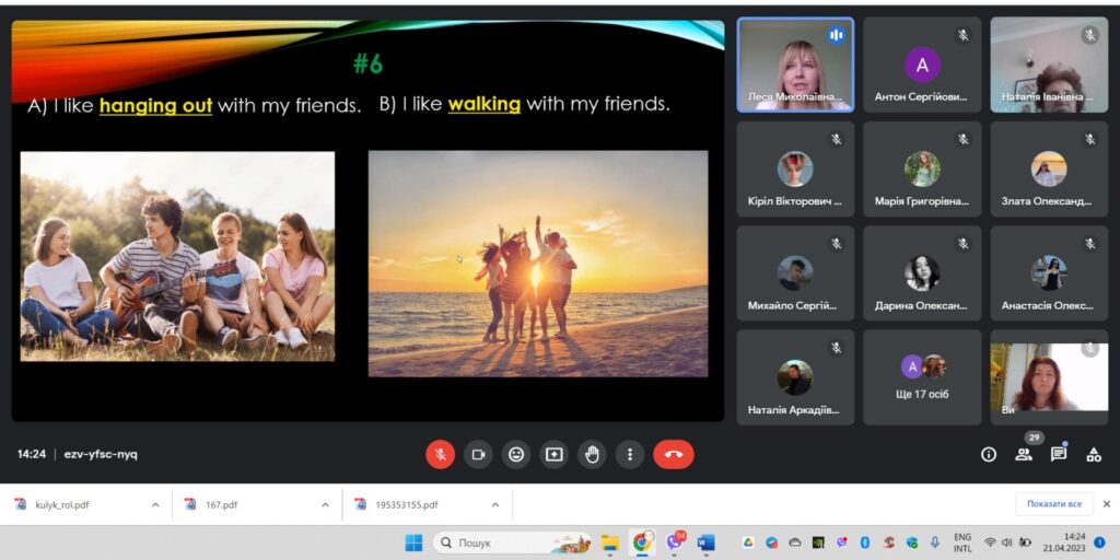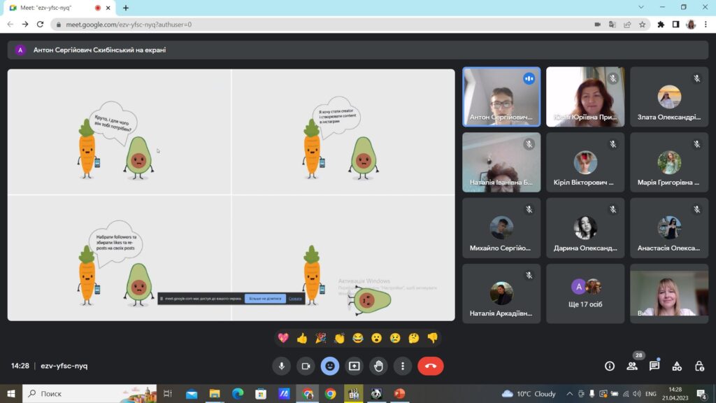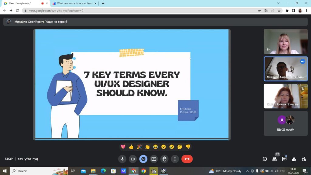 Учасники заходу підготували цікаві презентації з тем «Top seven idioms the translation of which you will not find in dictionaries», «Top seven terms widely used in personal communication», «Top seven abbreviations in English slang», «Seven essential motion graphics terms», «Seven key terms every UI/UX designer should now», за допомогою яких всі присутні дізнались щось нове для себе як з загальної англійської мови, так і фахової. Крім того, пригадали американізми у мовленні сучасної молоді та професійному жаргоні, які з’явились останніми роками, та чи доцільно їх перекладати.