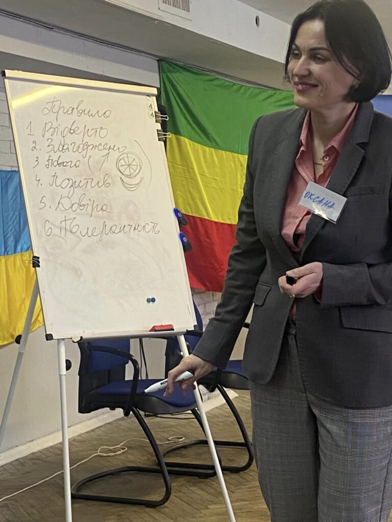 Тренером виступила Оксана Павлюк – доктор філософії 053 Психологія, доцент кафедри педагогіки та психології професійної освіти ФЛСК, практичний психолог ДНЗ”КЦПТО.