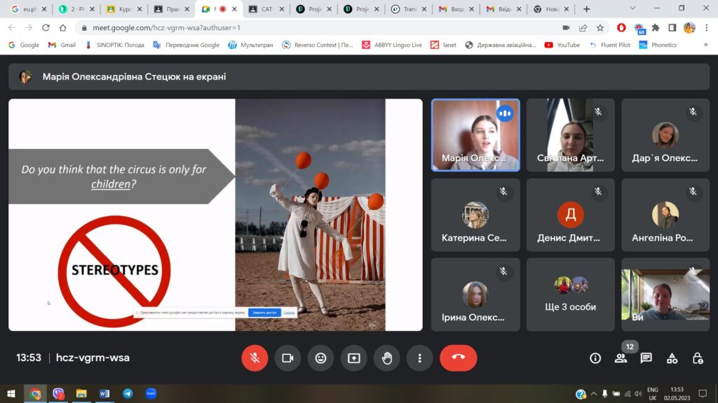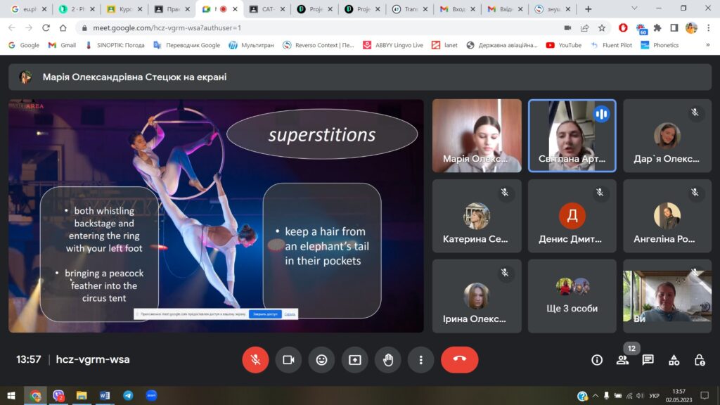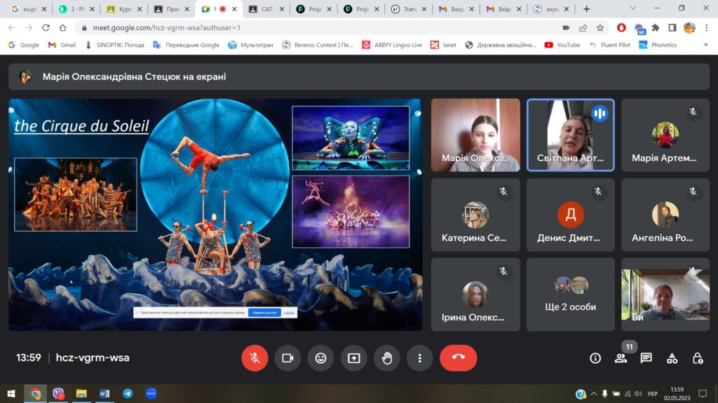 Під час культурно-освітнього вебінару викладач зі студентами обговорили історію виникнення виконавчого мистецтва, розвиток сучасного сценічного мистецтва у різних країнах та в Україні, його найвідоміші різновиди, такі як театр тіней, Цирк дю Солей, а також зосередились на індивідуальних вподобаннях кожного присутнього, адже мистецтво завжди є суб’єктивним та неповторним для кожної людини.