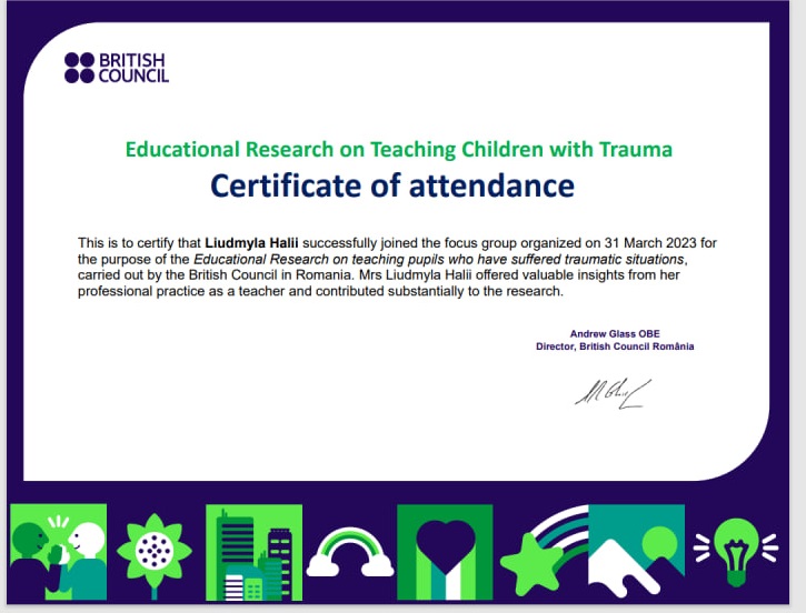 Попри повномасштабне вторгнення в Україну, освітянська нива продовжує розвивати міжнародну співпрацю, водночас відповідаючи на виклики сьогодення та адаптуючись до сучасних реалій. Саме тому British Council за підтримки IOM (International Organization of Migration) та UNICEF розпочали проект Teaching and Learning in Difficult Times, який спрямований як на психологічну адаптацію вчителів та викладачів англійської мови до роботи із травмованими підлітками, так і на методологічну адаптацію навчальних матеріалів в умовах війни, стресу та зміни навчальної програми. Викладач кафедри англійської філології ФЛСК Галій Людмила Георгіївна пройшла даний курс навчання, за результатами якого була обрана до участі у фокус-групі “Educational Research on Teaching Children with Trauma” в рамках навчального дослідження, яке проводить British Council Romania.