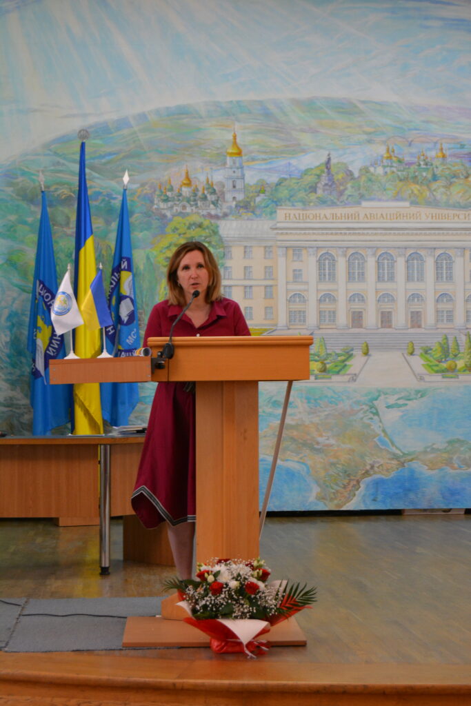 З вітальним словом до випускників звернулася проректор з гуманітарної політики та інновацій НАУ Світлана Тімкіна, яка високо оцінила вклад випускників у розвиток студентського самоврядування університету, побажала їм наснаги, віри у завтрашній день, завжди повертатися у стіни рідної alma mater і, звичайно, – мирного неба!