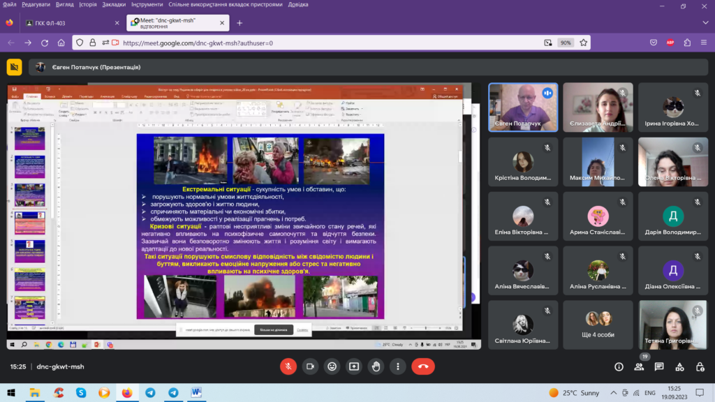 Євген Михайлович розповів, які сімейні ролі є важливими для гармонійного життя людини, як родина здатна виконувати велику кількість важливих функцій в умовах війни, а саме: підтримання моделі гармонійної родини, втілення членами родини певних сімейних ролей та запобігання появи емоційної байдужості. Євген Потапчук поділився важливими знаннями щодо зміцнення сімейних стосунків та підтримки одне одного і надав поради щодо ефективних методів подолання стресу та підтримки психічного здоров’я. Психологічний аспект родинних стосунків у воєнний час був основним пунктом обговорення. Потапчук Євген Михайлович наголосив на важливості комунікації та взаєморозуміння в родині, що є важливим фактором психологічної стійкості.