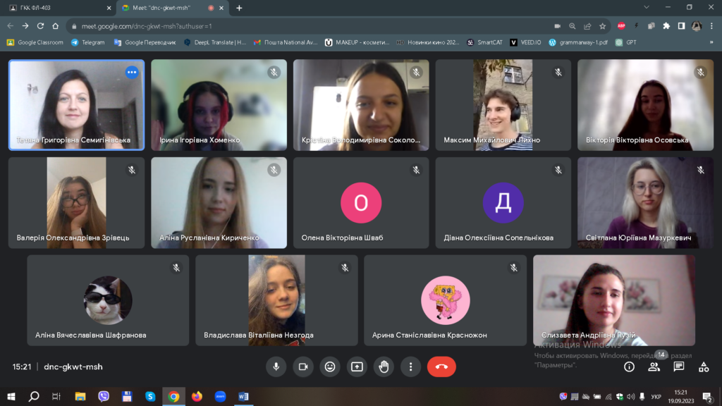 19 вересня 2023 року проведено виховний захід для студентів 4-го курсу (група 403), магістром 2-ого курсу, спеціальності «Філологія» Пузій Єлизаветою під керівництвом викладача-методиста, доцента кафедри англійської філології і перекладу Тетяни Семигінівської.
