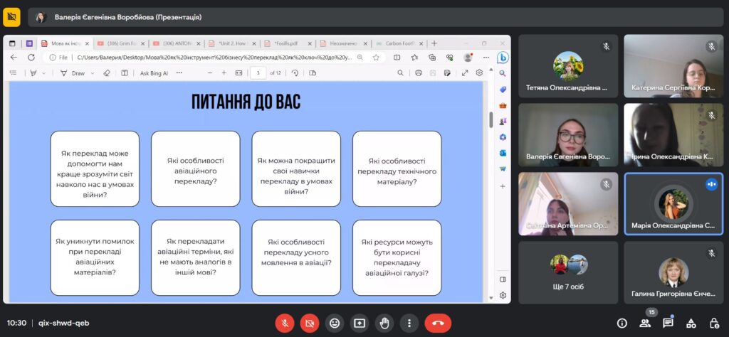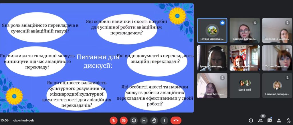 Воробйова Валерія та Тетяна Кулинич презентували інформацію щодо перекладу у сфері авіації. Учасники дискусії дійшли висновку, що фахівець із перекладів авіаційних текстів повинен мати не лише лінгвістичну освіту, а й вищу технічну. Сучасні літаки дуже швидко змінюють свою конфігурацію та комплектацію, розробники-інженери постійно вдосконалюють запчастини та винаходять нові, саме тому стрімко зростає попит та потреба у перекладі авіаційних текстів. Валерія Воробйова наголосила, що авіаційний переклад передбачає визначеність, конкретність та дослівність трактування, у зв’язку з цим необхідно знати всі тонкощі, особливості та розуміти термінологію авіаційної промисловості.