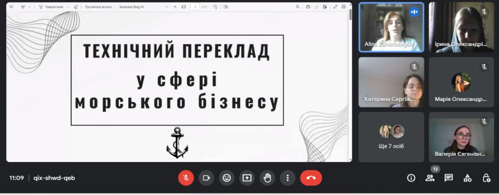У своїй доповіді Аліна Загороднюк розповіла про специфіку перекладу у сфері морського бізнесу, зазначила, що переклад документів, пов’язаних з морським спрямування, вимагає глибоких знань у цій галузях, а також досконалого знання мови оригіналу та мови перекладу. Під час обговорення доповіді учасники заходу поставили багато запитань Аліні Загороднюк. Вони цікавилися, як правильно перекладати морську термінологію, як уникнути помилок у перекладі технічного тексту тощо.