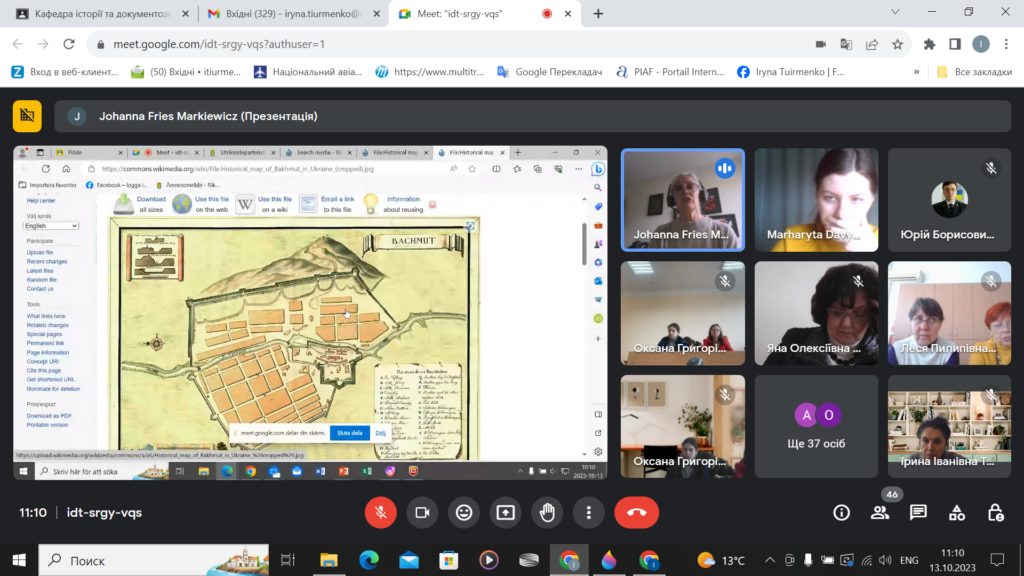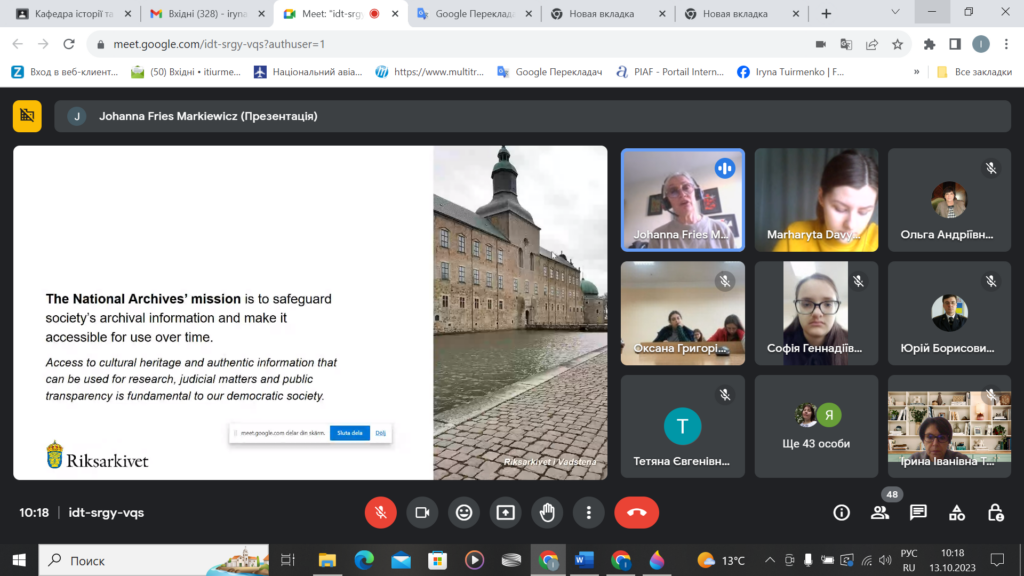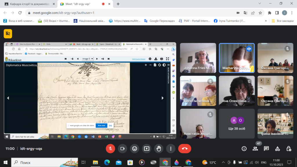 13 жовтня 2023 р. відбулася онлайн зустріч Йоханни Фріс Маркевич – міжнародного координатора Національного архіву Швеції зі здобувачами вищої освіти спеціальності 029 «Інформаційна, бібліотечна та архівна справа» кафедри історії та документознавства Факультету лінгвістики та соціальних комунікацій. Вперше пані Йоханна познайомилася з Україною ще у 2008 р. і з того часу неодноразово її відвідувала. Зокрема, 2021 р., як Головний зберігач фондів Національного архіву Швеції, пані Йоханна привезла латиномовний варіант Конституції Пилипа Орлика до 30-річчя української незалежності, а навесні 2023 р. відвідала Київські та Харківські архіви.