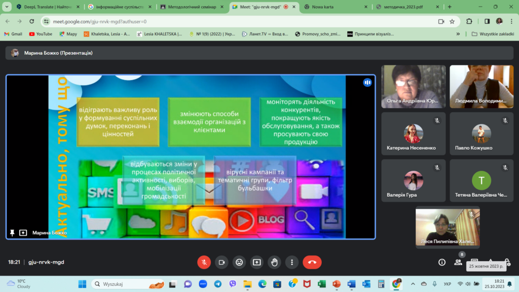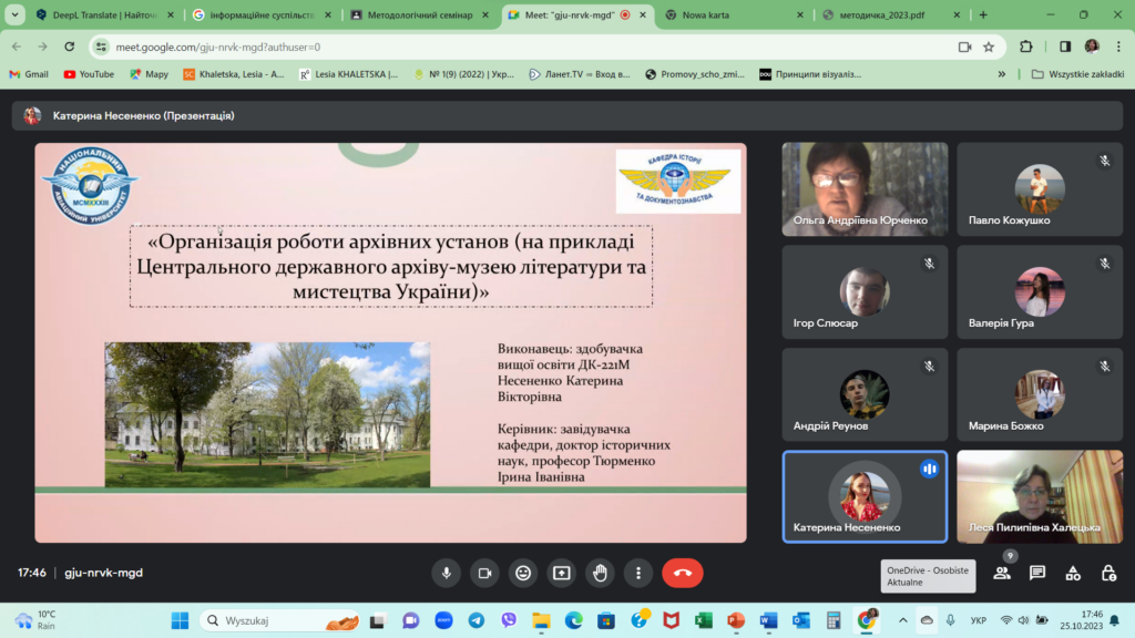 25 жовтня 2023 р. відбулось засідання наукового гуртка «Академічні вимоги до написання курсових проєктів та кваліфікаційних робіт» для здобувачів вищої освіти спеціальності 029 «Інформаційна, бібліотечна та архівна справа» (керівники: д.іст.н., проф. Тюрменко І.І., к.іст.н., доц. Юрченко О.А.). В засіданні взяли участь здобувачі вищої освіти ОС «Магістр» Антонов Д.В., Божко М.Г., Гарбар В.О., Гура В.С., Кожушко П.П., Несененко К.В., Реунов А.В., Слюсар І.В., Чечота Т.В. Основна увага на зустрічі була приділена обговоренню проблем написання кваліфікаційних робіт магістрів, зокрема її вступної частини. Здобувачі, їх наукові керівники, викладачі кафедри обговорили зміст кожної роботи, мету та завдання, об’єкт та предмет дослідження, наукову новизну. Були зроблені окремі зауваження та рекомендації щодо більш точного формулювання даних позицій. В цілому всі здобувачі активно працюють над написанням кваліфікаційних досліджень та готуються до їх захисту.