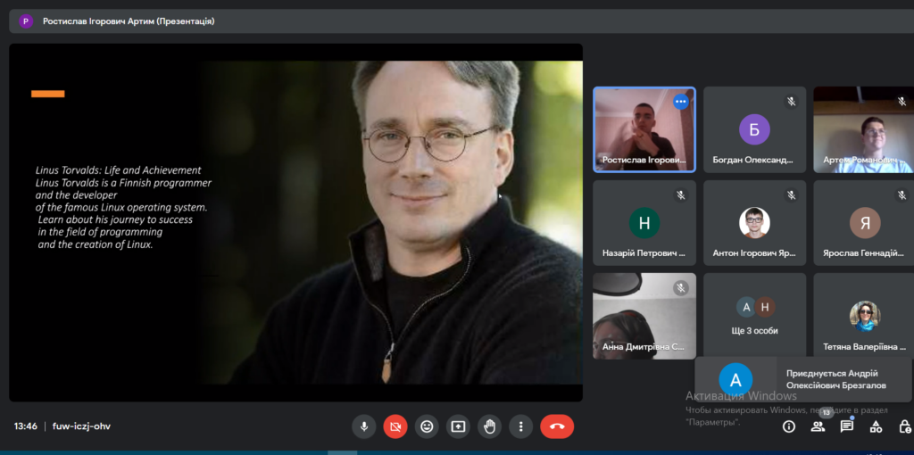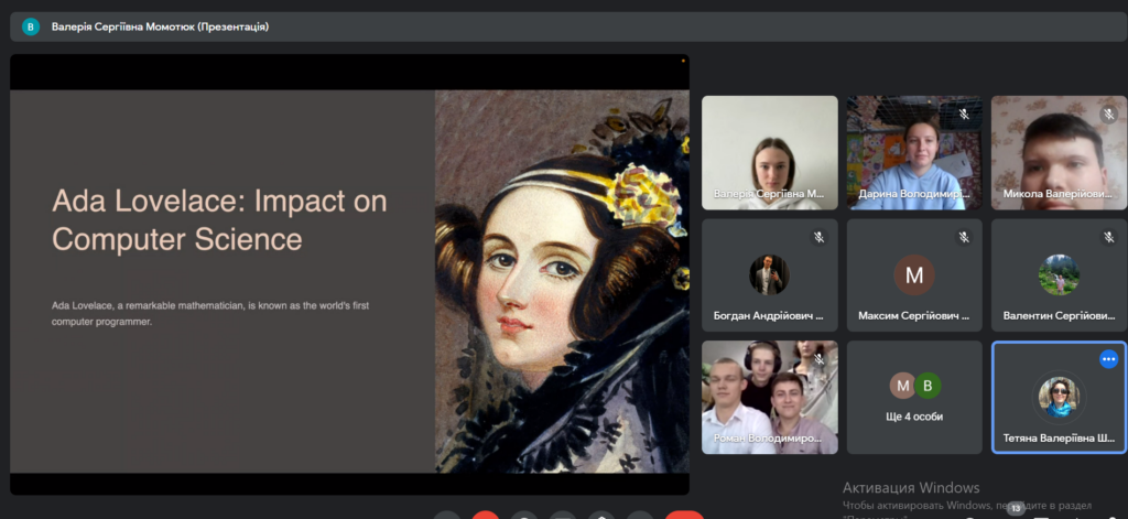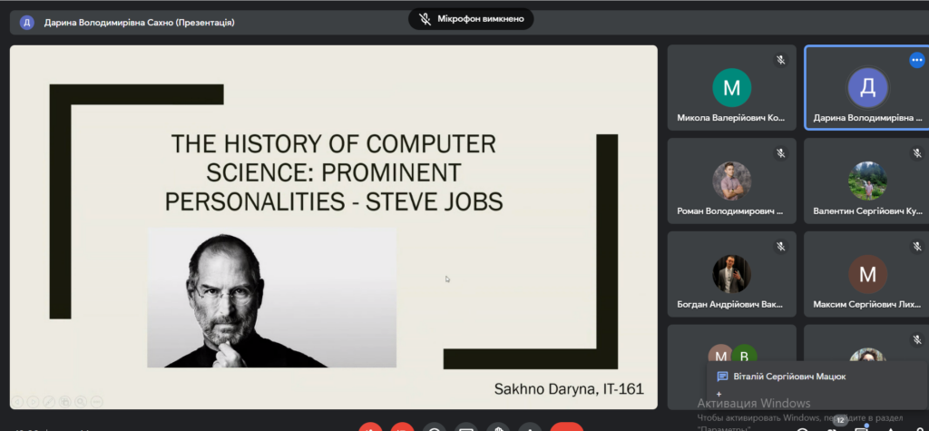 30 жовтня 2023 року на кафедрі іноземних мов за фахом ФЛСК НАУ відбулося засідання студентського наукового гуртка «English speaking club» під керівництвом старшого викладача Шульги Тетяни Валеріївни. Студенти 1 курсу Факультету комп’ютерних наук та технологій груп 116, 161, 162 виступили з доповідями англійською мовою на тему: «The History of Computer Science: Prominent Personalities» (Історія комп’ютерної науки: видатні особистості), представивши цікаві презентації особистостей та подій, які значно вплинули на формування та розвиток сучасних комп’ютерних наук і технологій.