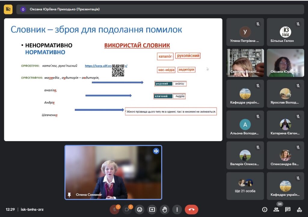 20 листопада 2023 року кафедра української мови та культури Факультету лінгвістики та соціальних комунікацій організувала гостьову лекцію доктора педагогічних наук, професора, завідувача кафедри української мови і літератури Сумського державного педагогічного університету імені А. С. Макаренка Олени Семеног за темою «Академічна культура здобувача вищої освіти: від теорії до практики». Лекцію було проведено в рамках навчальної дисципліни «Академічна доброчесність і професійна етика» для студентів-третьокурсників ОПП «Практична психологія».