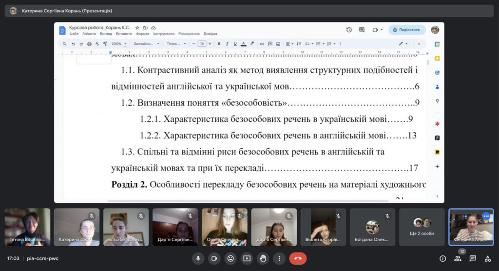 28 листопада 2023 року відбулось засідання наукового куртка «Контрастивне вивчення мов» під керівництвом доцента кафедри англійської філології і перекладу Крилової Т.В., де студенти-філологи представили результати своїх   наукових розвідок. Готуючи матеріали до наукових публікацій та участі у наукових конференціях, студенти розглядали питання морфології та синтаксису сучасних англійської та української мов: граматичні категорії повнозначних частин мови, роль службових слів, типи синтаксичних одиниць та їх функції, синтаксичні зв’язки й семантико-синтаксичні відношення. Аналізували питання порівняльної граматики з огляду на здобутки вітчизняного й зарубіжного мовознавства та сучасні філологічні ідеї. Таке типологічне зіставлення одиниць граматичного рівня спонукають студентів до активного мислення, приводять до виважених висновків щодо ізоморфізмів та аломорфізмів у граматичній будові порівнюваних мов і вчать долати міжмовну інтерференцію у процесі перекладу.