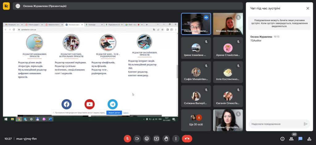 2 грудня 2023 року в межах вивчення дисципліни «Редагування перекладів» доцентом кафедри англійської філології і перекладу Мариною Пилипчук було організовано зустріч для студентів 4 курсу Спеціальності 035 «Філологія» з практикуючим перекладачем-редактором одного із провідних бюро українського ринку перекладацьких послуг – Technolex Translation Studio – Оксаною Журавльовою.