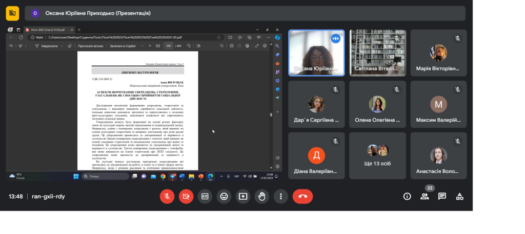 13 лютого 2024 року в рамках роботи студентського наукового гуртка «Актуальні проблеми наукової комунікації» (керівники – завідувач кафедри Світлана Литвинська та доцент кафедри Оксана Приходько), що функціонує на кафедрі української мови та культури, було проведено третє засідання за темою «Стаття, тези: вимоги до написання та оформлення». Засідання було приурочено підготовці друкованих матеріалів у науковому збірнику тез до ХХІV Міжнародної науково-практичної конференції молодих учених і студентів «ПОЛІТ. Сучасні проблеми науки».