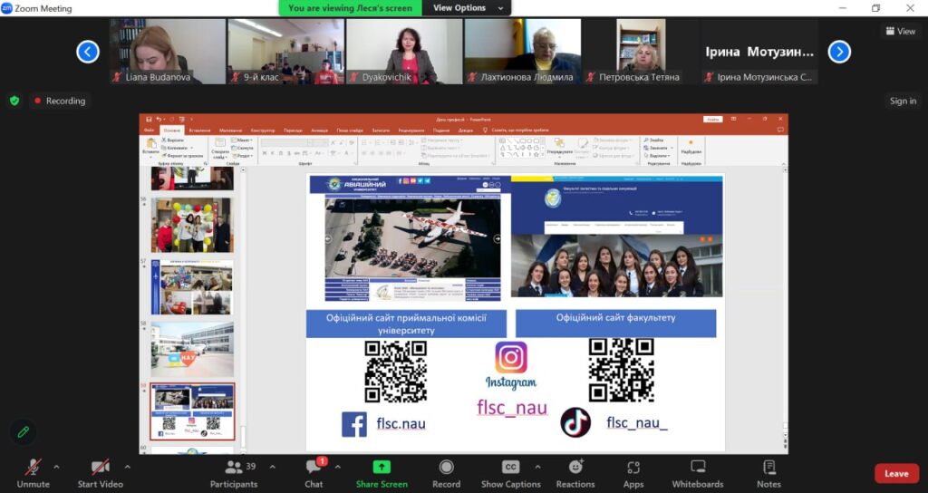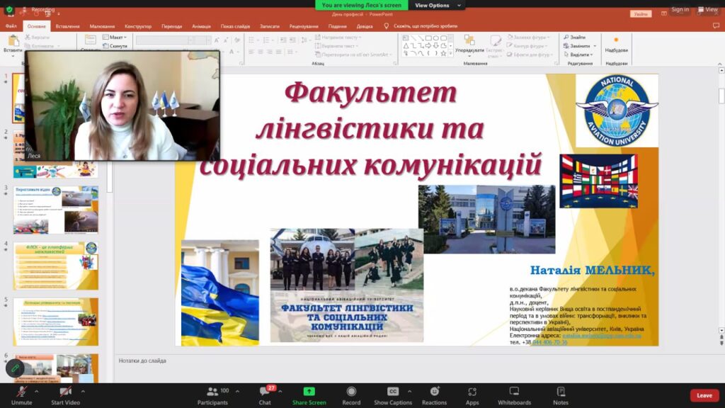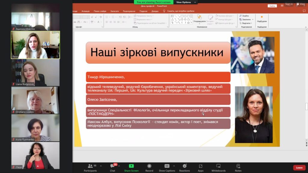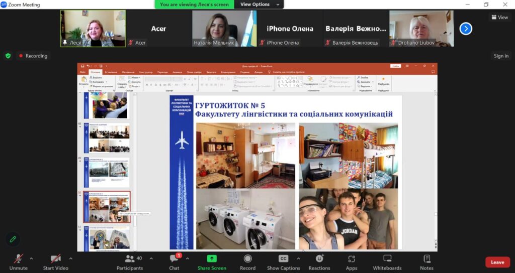 Учасники онлайн-заходу дізналися про діяльність Факультету лінгвістики та соціальних комунікацій, який об’єднує 10 кафедр, із них 6 – випускові, 3 навчально-наукові та 7 навчальних лабораторії, комп’ютерні класи, лінгафонні кабінети та про спеціальності факультету: