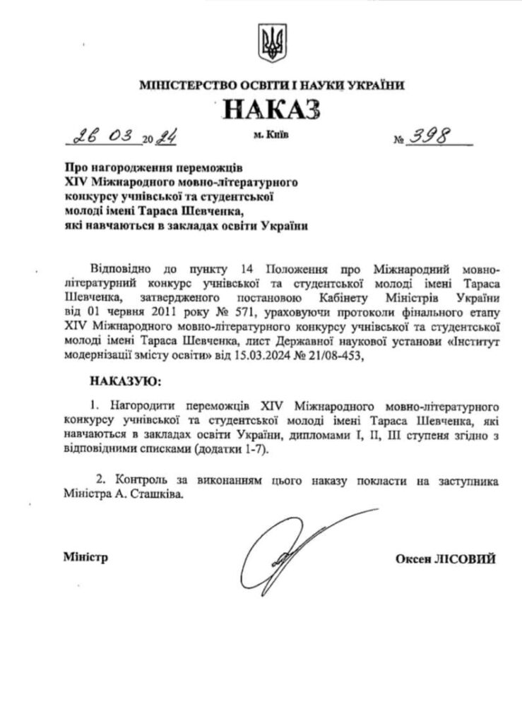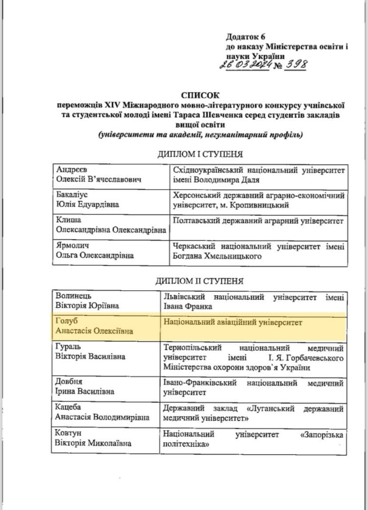 Студентка Національного авіаційного університету факультету лінгвістики та соціальних комунікацій Анастасія Голуб стала переможницею XIV Міжнародного мовно-літературного конкурсу учнівської та студентської молоді імені Тараса Шевченка! Під керівництвом викладачів кафедри української мови та культури студентка пройшла всі етапи Конкурсу, перемігши у фінальному, і стала однією з найкращих знавчинь творчості Тараса Шевченка. Відповідно до Наказу МОН України № 398 від 26.03.2024 Анастасію Голуб нагороджено Дипломом ІІ ступеня.