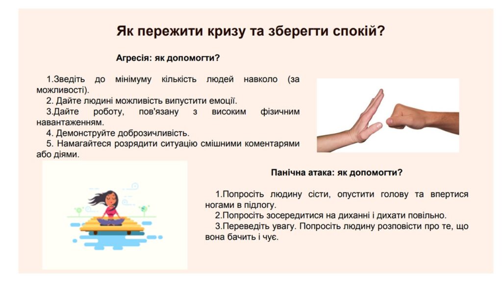 Леся Хоменко-Семенова презентувала навчальний матеріал стосовно алгоритму дій під час сигналу «Повітряна тривога», хімічної загрози, поведінки з вибухонебезпечними речовинами, радіаційної небезпеки та особливостей психологічної підтримки близьких і самих себе під час небезпеки.