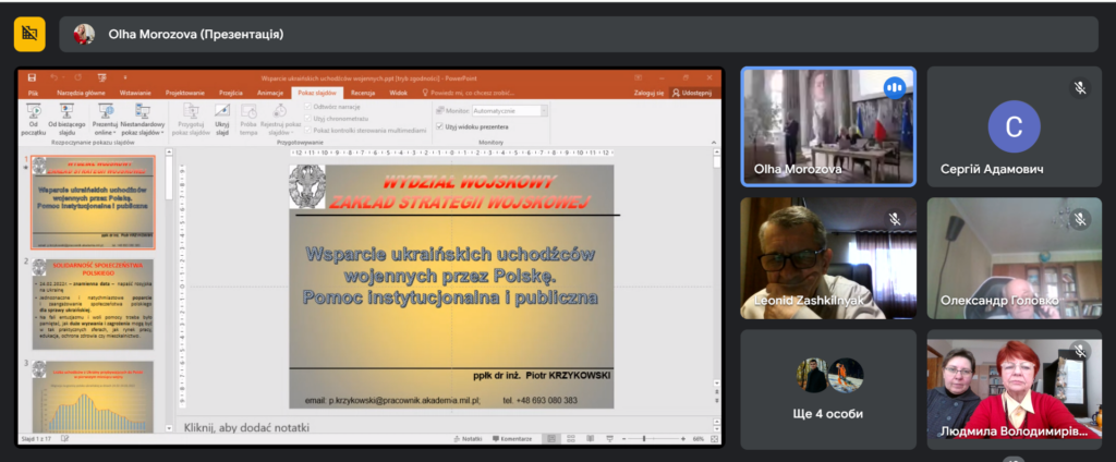 11-12 квітня 2024 року доцентки кафедри історії та документознавства ФЛСК НАУ Людмила Божук і Леся Халецька взяли участь (онлайн) в роботі міжнародної наукової конференції «Stosunki polsko-ukraińskie wobec rosyjskiej agresji na Ukrainę: konteksty historyczne i współczesne» («Польсько-українські відносини в умовах російської агресії проти України: історичний та сучасний контексти»). Організатором конференції виступив Факультет історії Варшавського університету; співорганізаторами: Факультет політології та журналістики Університету імені Адама Міцкевича у Познані, Навчально-науковий інститут міжнародних відносин, історії та філософії Черкаського національного університету імені Богдана Хмельницького у співпраці з Інститутом української археографії та джерелознавства імені М. С. Грушевського НАН України, Музеєм польських дітей-жертв тоталітаризму.