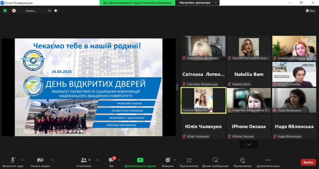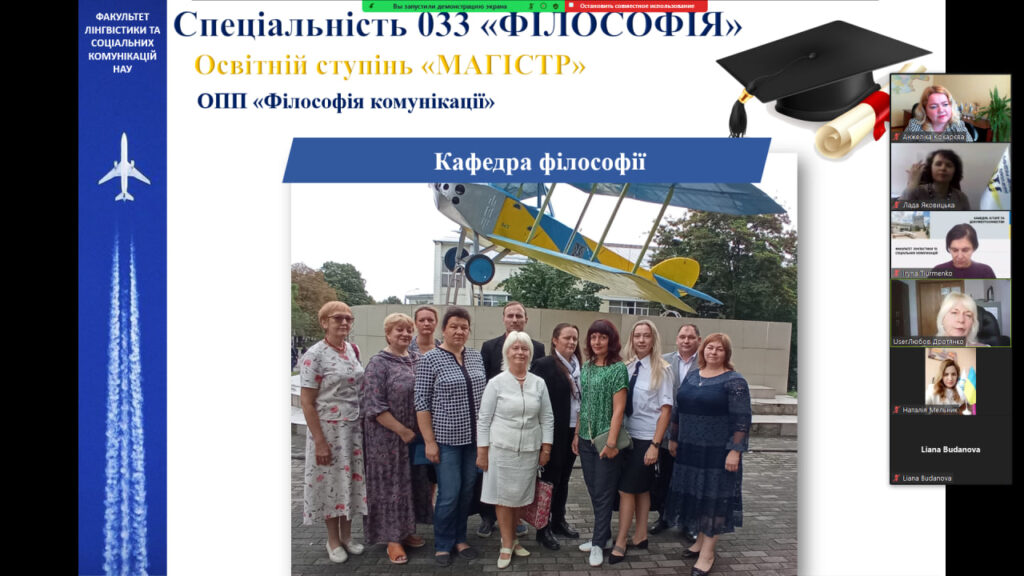 Учасники онлайн-заходу дізналися про діяльність Факультету лінгвістики та соціальних комунікацій, який об’єднує 10 кафедр, із них 6 – випускові, 3 навчально-наукові та 7 навчальних лабораторії, комп’ютерні класи, лінгафонні кабінети та про спеціальності факультету: