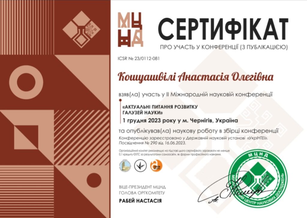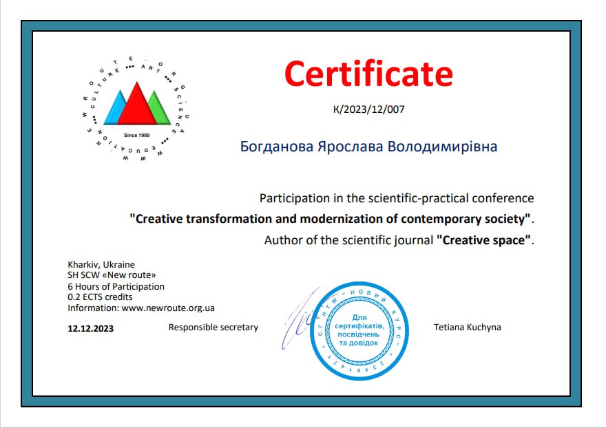 Незважаючи на продовження військових дій та військовий стан на території нашої країни, члени наукового гуртка «Проблеми та перспективи розвитку перекладу» (керівник – доцент кафедри англійської філології і перекладу Сітко А.В.) активно працюють в онлайн форматі, презентуючи свої наукові пошуки. Так, 22.05.2024 року було проведено підсумкове засідання гуртка в онлайн форматі. На засіданні студенти-гуртківці ділилися враженнями від участі у науково-практичних конференціях, висловлювали думки щодо перспективних напрямків дослідження та побажання щодо тематики та формату проведення гуртка наступного року, адже одним із основних критеріїв оцінки якості наукового гуртка, є, безперечно, кількість та якість наукових публікацій студенів як молодих перспективних учених. Як відомо, студентська наука є частиною загальної наукової діяльності, хоча й відрізняється більшою мірою інтерактивності щодо реалій сьогодення. Учасники проблемної групи «Проблеми та перспективи розвитку перекладу» взяли участь у роботі 13 Міжнародних науково-практичних конференцій, 6 з яких є закордонними, що проводилися в Бельгії (7), Німеччині (5), Португалії (1), Великій Британії (1), Австрії (3) та Іспанії (1). Результати власного наукового доробку також було оприлюднено студентами-гуртківцями на наукових платформах у містах Івано-Франківськ, Харків, Суми, Чернігів, Одеса, Київ та Луцьк. За результатами роботи проблемної групи було опубліковано 28 статей та тез доповідей.
