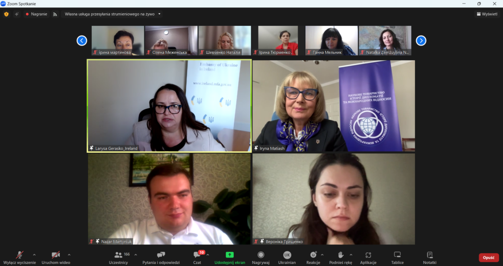Увазі учасників були представлені виступи: спеціального гостя Ігоря Жалоби – доктора історичних наук, професора, Президента Пан’Європа Україна, заступника Голови Правління Наукового товариства історії дипломатії та міжнародних відносин, старшого наукового співробітника Інституту історії України Національної академії наук України – «Війна як виклик для публічної дипломатії»; Лариси Герасько – Надзвичайного і Повноважного Посла України в Ірландії – «Виклики дипломатії в часі війни»; Марини Гримич – доктора історичних наук, кандидата філологічних наук, професора, письменниці, менеджерки культурних проєктів – «Дружина Посла і співпраця Посольства з громадою: досвід і виклики»; Олесі Шевченко – дружини Надзвичайного і Повноважного Посла України в Республіці Молдова, Президента Міжнародного жіночого клубу Республіки Молдова – «Інструментарій культурної дипломатії Президента Міжнародного жіночого клубу Молдови і дружини Посла». У своїх виступах доповідачі різнобічно висвітлили проблематику особливостей публічної дипломатії в часі війни, спираючись на власний життєвий досвід: з точки зору безпосереднього учасника воєнних дій, діючого професійного дипломата, дружини посла. Доповіді викликали зацікавлення учасників, які мали змогу поставити питання, поспілкуватися з шановними виступаючими, висловити своє захоплення і вдячність виступаючим, кожен з яких на своєму робочому місці захищає нашу державу, представляє світові її унікальність, багату давню історію, культурне різноманіття і робить це з величезною любов’ю до України, її народу, повагою до міжнародного співтовариства.