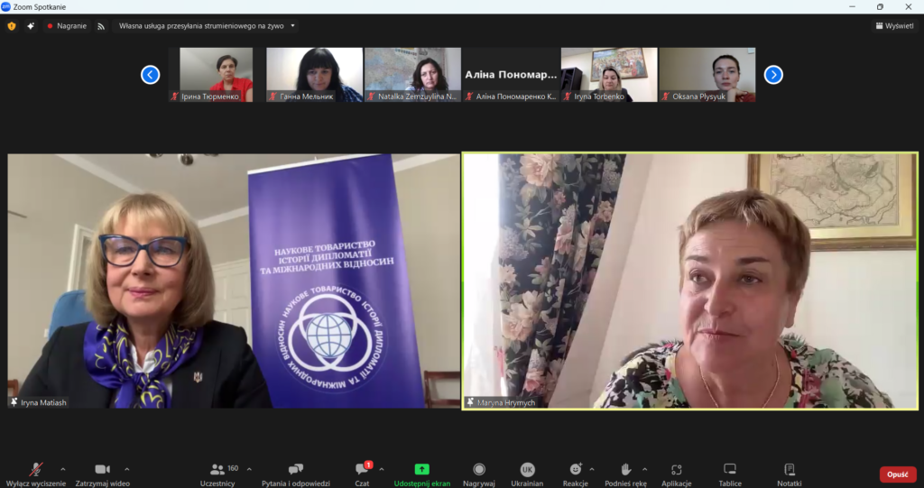 21 червня 2024 завідувачка кафедри історії та документознавства, докторка історичних наук, професорка Ірина Тюрменко та кандидатка історичних наук, доцентка Леся Халецька взяли участь в онлайн-заході «Жінка в дипломатії в час війни. Як протистояти російській агресії на “дипломатичному фронті”?» – фінальному в рамах циклу «Жінка в дипломатії: виклик чи місія?», який є частиною реалізації проєкту Наукового товариства історії дипломатії та міжнародних відносин «Жіноче обличчя дипломатії» (автор і куратор – доктор історичних наук, професор Ірина Матяш) за підтримки Фонду Ганнса Зайделя в Україні.