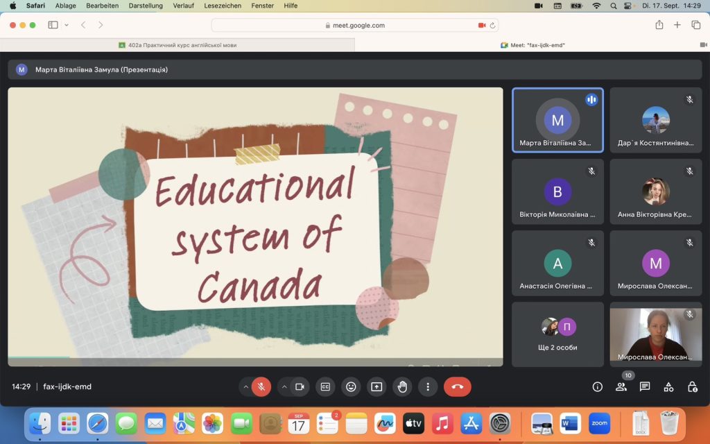 17 вересня в рамках переддипломної практики магістрантка Мирослава Михайленко під керівництвом доцента кафедри англійської філології і перекладу Оксани Полякової організувала дискусію для студентів групи 402. Темою зустрічі була «Система освіти по всьому світу».