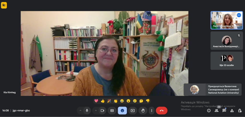 Кія Кімхат – заслужена викладачка, провідна лекторка департаменту педагогічної освіти Факультету освіти та бізнесу Університету Євле, м. Євле, Швеція, говорила про бачення освіти та наукової спільноти в міжнародних перспективах;