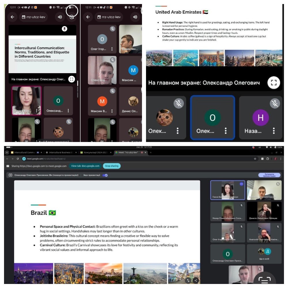 Під час заходу в дружній та позитивній атмосфері студенти обмінялися думками та підготували презентації з теми англійською мовою. Зокрема, було зазначено, що у глобалізованому світі студенти стикаються з представниками різних культур у навчанні, роботі та подорожах, тож розуміння норм, традицій та етикету допомагає уникати непорозумінь, сприяє ефективному спілкуванню та налагодженню стосунків. Також студенти зазначили, що вивчення даного питання є практичною підготовкою до міжнародної співпраці, оскільки багато студентів прагнуть побудувати кар’єру у міжнародних компаніях, де важливо знати особливості ділового етикету різних країн, а розуміння культурних відмінностей допомагає уникати помилок, які можуть зашкодити діловим відносинам.