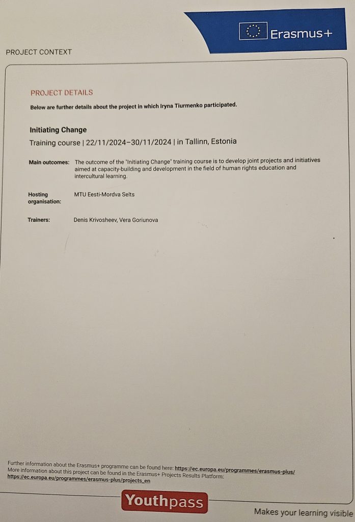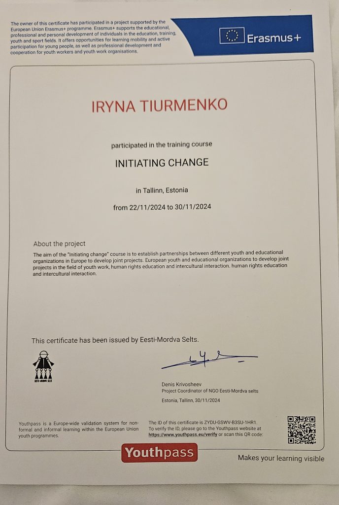 Докторка історичних наук, професорка кафедри української мови, історичних та соціоінформаційних комунікацій Ірина Тюрменко пройшла тижневе навчання на семінарі “Initiating change” за програмою Erasmus+. Семінар проходив в м. Таллінні з 22 по 30 листопада 2024 р. Упродовж навчання відбувся обмін досвідом із проєктної діяльності в галузі прав людини та міжкультурної освіти. За допомогою інструменту дизайн-спринт проводилося навчання з розробки нових ідей для створення нових проєктів. На семінарі були продемонстровані можливості програми еrasmus+ для молоді, подана детальна інформація про інші європейські фонди і гранти, які підтримують освітні ініціативі стосовно прав людини та міжкультурної комунікації. Важливою частиною роботи семінару стало відпрацювання методів побудови партнерських відносин та розроблення власних проєктних пропозицій для отримання грандів. Поради від практиків із написання проектів дозволили глибше зануритися у проєктний процес та зрозуміти основні вимоги до нього.
