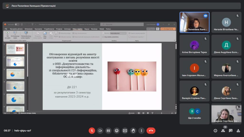 23 лютого 2024 року під час проведення години корпоративної культури відбулося обговорення результатів опитування здобувачів вищої освіти ДК 221 (наставник Леся ХАЛЕЦЬКА) з питань розуміння якості освіти за ОПП «Документознавство та інформаційна діяльність» зі спеціальності 029 «Інформаційна, бібліотечна та архівна Читати далі