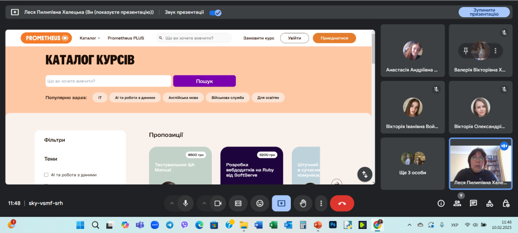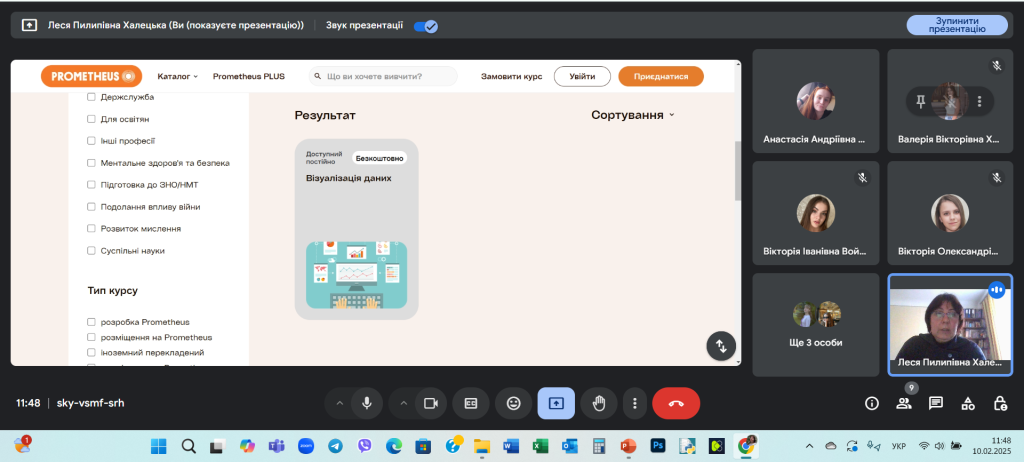 10 лютого 2025 року в межах опанування навчальної дисципліни «Візуальна аналітика» доцент кафедри української мови, історії та інформаційної діяльності Леся Халецька ознайомила здобувачів вищої освіти 2 та 3 року навчання спеціальності 029 «Інформаційна, бібліотечна та архівна справа» освітньо-професійної програми «Документознавство та інформаційна діяльність» з можливостями здобуття неформальної освіти, що їх надає Prometheus – найбільша онлайн-платформа професійного розвитку в Україні. Зокрема, платформою пропонується безплатний онлайн-курс «Візуалізація даних», який допоможе слухачам опанувати основні принципи та інструменти для ефективної подачі інформації.