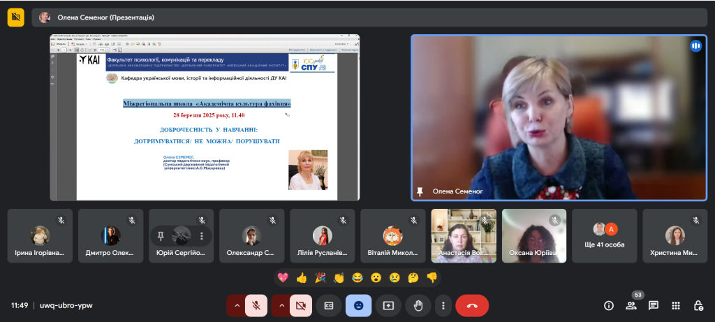 28 березня 2025 року у віртуальних стінах Державного університету «Київський авіаційний інститут» на запрошення кафедри української мови, історії та інформаційної діяльності факультету психології, комунікацій та перекладу та в рамках діяльності Міжрегіональної школи «Академічна культура фахівця» відбулася гостьова лекція Олени Семеног, докторки педагогічних наук, професорки, керівниці Центру науково-освітнього партнерства і мережевої взаємодії, професорки кафедри педагогіки Сумського державного педагогічного університету імені А. С. Макаренка за темою «Доброчесність у навчанні: дотримуватися / не можна / порушувати».