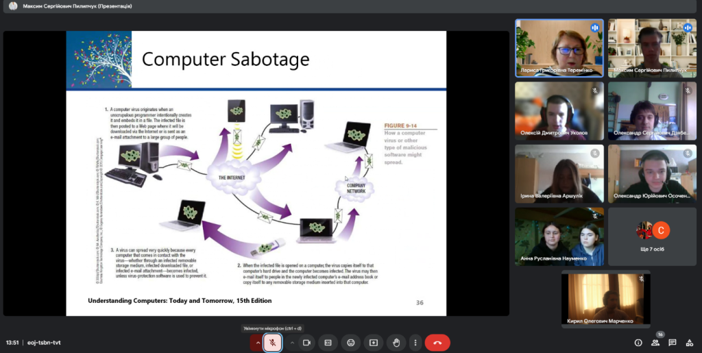 28 березня 2025 року на кафедрі іноземних мов професійного спрямування відбулося засідання студентського наукового гуртка «English speaking club» під керівництвом доцента кафедри Лариси Теремінко. Студенти 1 курсу Факультету комп’ютерних наук та технологій розглянули актуальну проблему безпеки в Інтернеті (Internet Security). Майбутні ІТ-фахівці визначили можливі загрози й ризики кіберзлочинів, їх вплив на життя суспільства, навели приклади кібератак і їх наслідків. Здобувачі вищої освіти підготували презентації та обговорили заходи забезпечення конфіденційності особистої інформації в мережі, важливість регулярного оновлення програмного забезпечення й створення резервних копій даних, заходи безпеки для домашніх мереж Wi-Fi та методи захисту від несанкціонованого доступу, вірусів і фішингу тощо.