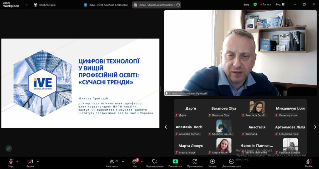 Микола Пригодій (НАПН України) окреслив сучасні тренди цифрових технологій у вищій професійній освіті, а Андрій Гуралюк представив практичні можливості використання баз даних Scopus та WoS через інструменти Clarivate і Elsevier.