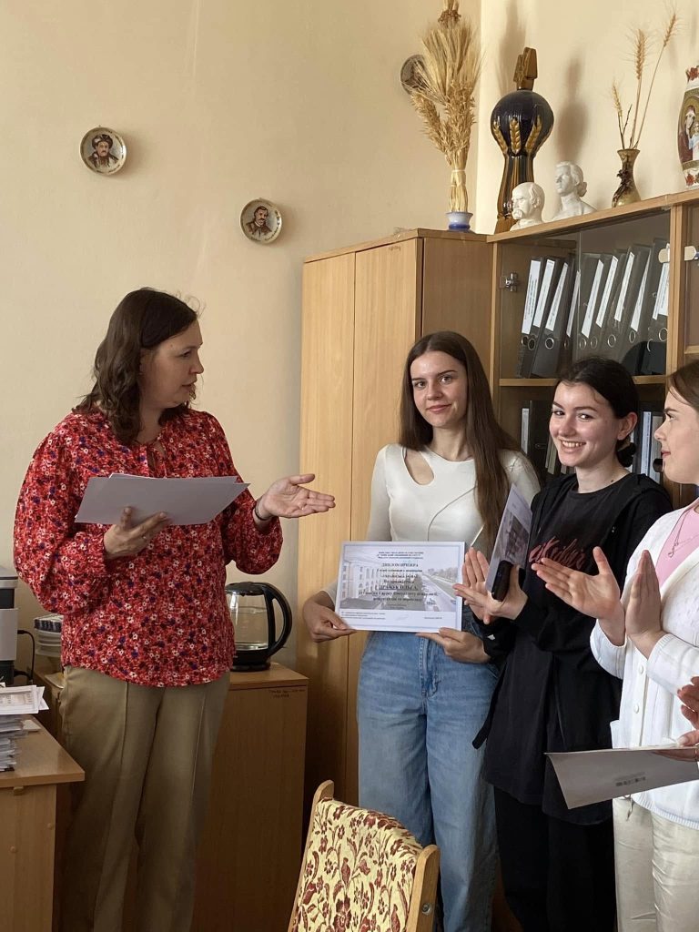Виконувачка обов’язків завідувачки кафедри Анастасія Сібрук привітала переможців із досягненнями, вручила їм дипломи та подяки, висловила вдячність за активність, натхнення та любов до української мови, історії України й наукової діяльності. Анастасія Сібрук відзначила важливість ролі студентів у розвитку науки та культури і побажала їм нових перемог, віри у власні сили, наполегливості у навчанні й натхнення на нові успіхи.