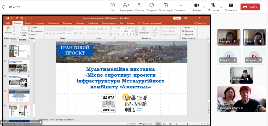 Ірина Тюрменко, Людмила Божук і Леся Халецька виступили з доповіддю на тему «Війна у реальному часі: практики документування та репрезентації», в якій представили результати дослідження практик документування і репрезентації воєнних свідчень шістьма різними за статусом та підходами організаціями, які активно працюють у цій сфері: Центром документування російських злочинів в Україні ім. Рафала Лемкіна (Інститут Пілецького, Польща), правозахисним фестивалем Docudays UA (Україна) з його «Архівом війни», волонтерською платформою Dattalion, Українським інститутом національної пам’яті, громадською організацією «Майдан Моніторинг», а також благодійним проєктом Музей «Голоси Мирних» Фонду Ріната Ахметова.
