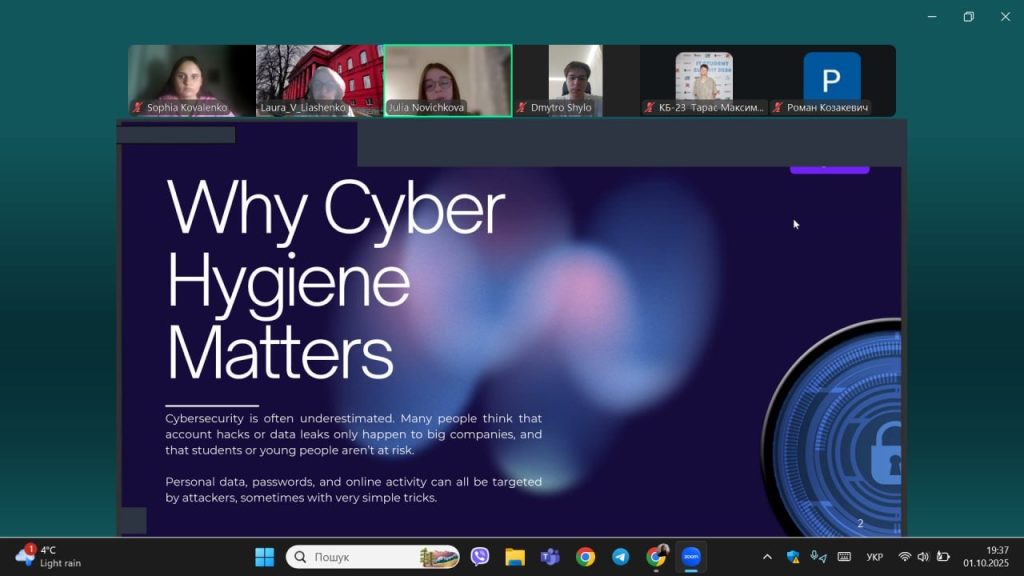 Воркшоп було проведено в межах студентського дослідницького проєкту з дисципліни «Англійська мова для професійних цілей», який підготувала та презентувала Юлія Новічкова, студентка 2 курсу кафедри кібербезпеки та захисту інформації КНУ імені Шевченко. Випускниця програми Cybersecurity for Small Organizations за підтримки Google, Юлія поділилася практичними порадами щодо безпечної поведінки онлайн та захисту персональних даних.