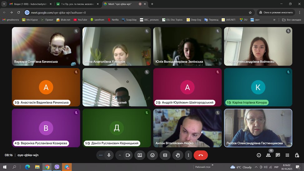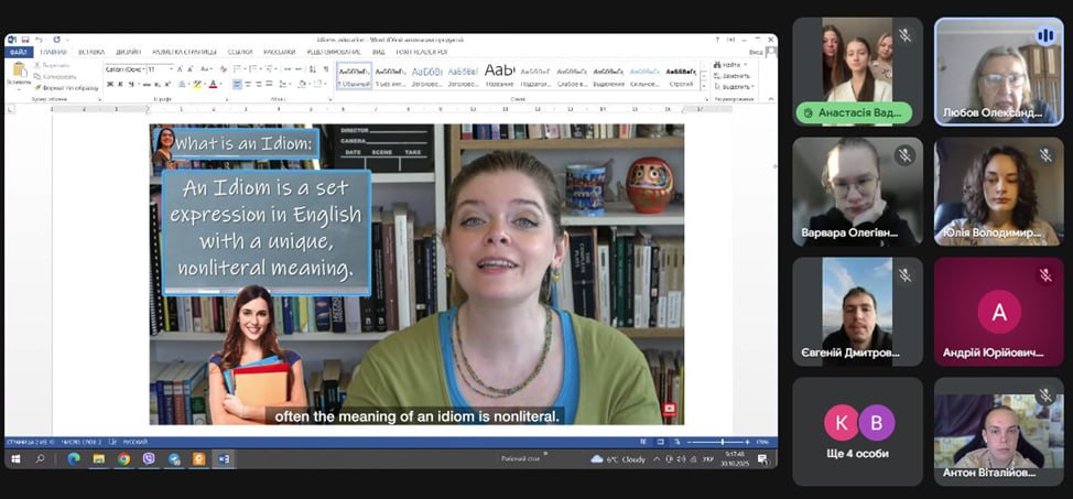 30 жовтня 2025р. на кафедрі англійської філології і перекладу було проведено засідання наукового студентського гуртка «Неологізми та ідіоми сучасної англійської мови», керівник гуртка старший викладач Гастинщикова Л.О. На порядку денному були три питання: 1) важливість для студентів долучатися до наукової роботи та що це дає сьогодні та у перспективі; 2) які можливості є у студентів, щоб долучатися до науково-дослідної роботи; 3) Стипендіальна програма для студентів Фонду Віктора Пінчука «Завтра.UA» 4) роль і місце ідіом у сучасній англійській мові.